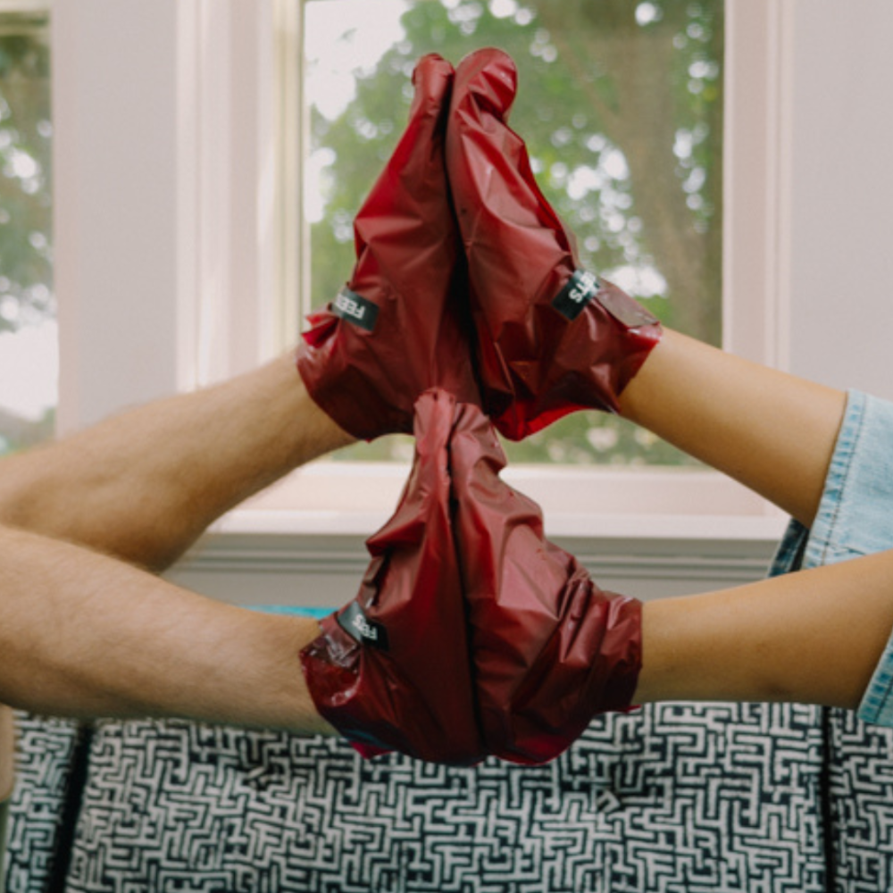 - Place cleansed, dry feet into the inner pouch of the foot masks and apply stickers to secure them around your ankles