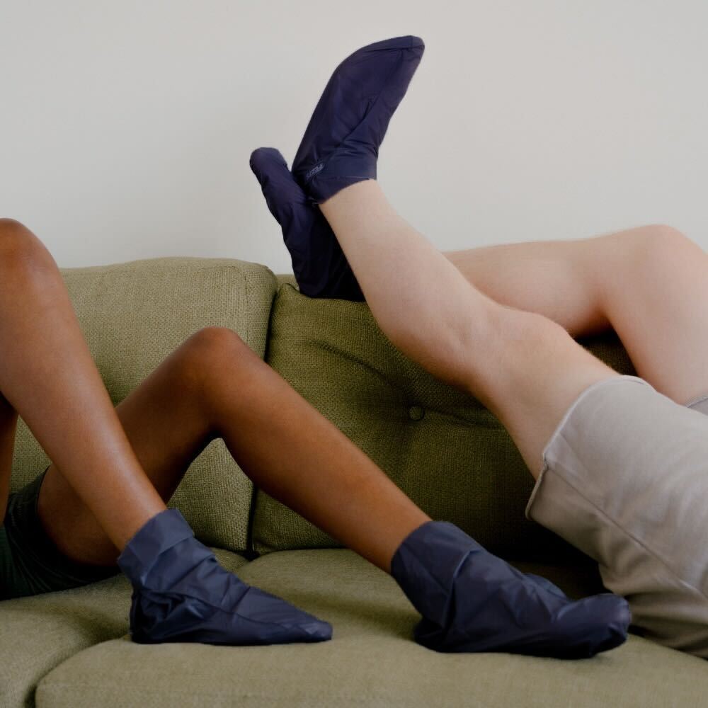 2. Place cleansed, dry feet into the inner pouch of the foot masks and apply stickers to secure them around your ankles